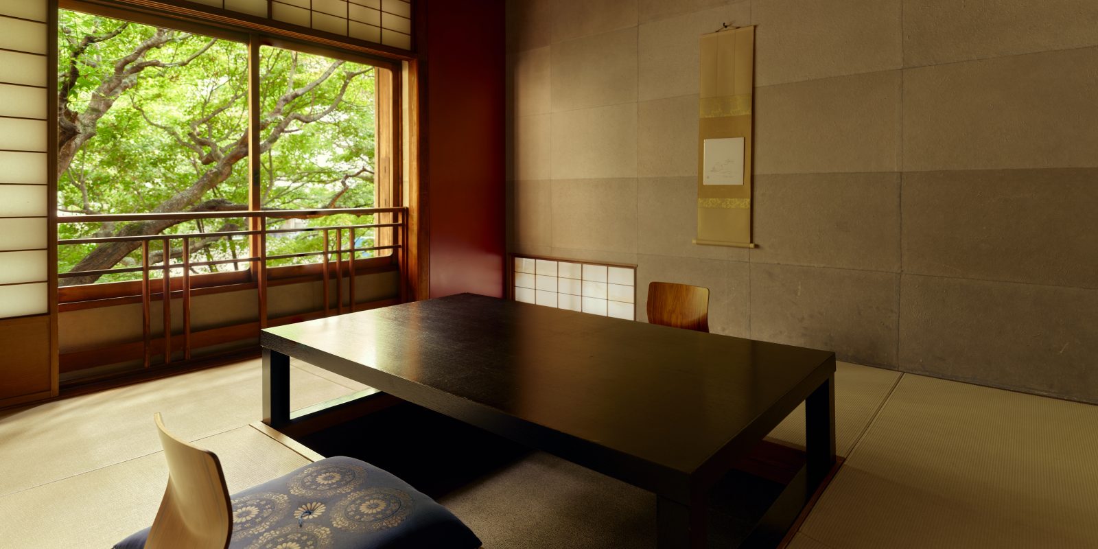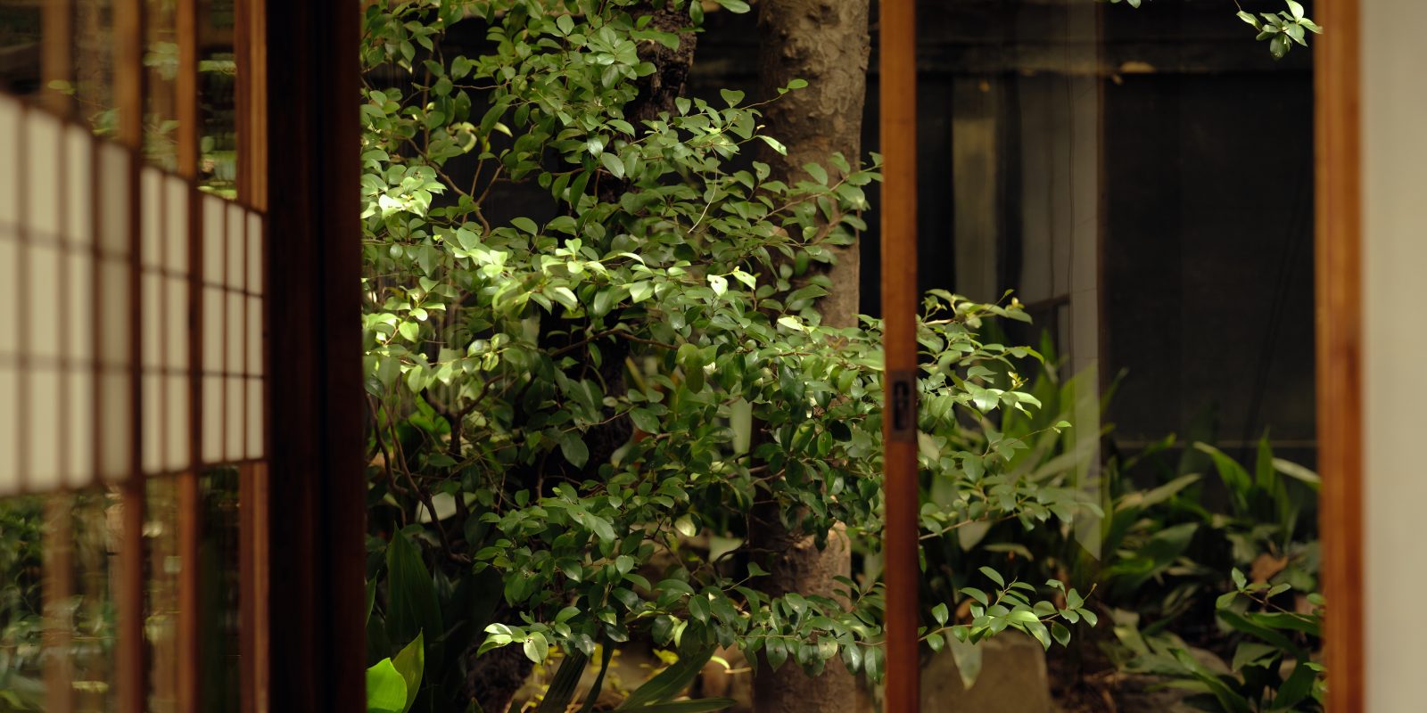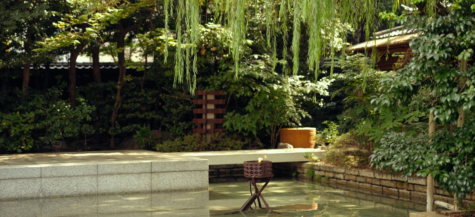 松尾流家元 松尾宗吾(不染斎)作の二つの坪庭を望むカフェ。庭には、竿が短く存在感のある六角灯籠、茶の道の習わしを思わせる蹲踞(つくばい)や、那智黒を使った枯山水、河文ならではの逸話の残る井筒があり、しっとりとした風情ある景色がご覧いただけます。お茶人が愛する姥目樫(ウバメガシ)や蚊母樹(イスノキ)などの緑が生い茂る様も圧巻。時を忘れてしまう空間です。