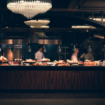 気品高いシャンデリアでエレガントなムード漂う2階の「ザ ボールルーム」。開放的な二面ガラス張りの窓から差し込む自然光が美しく、「舞踏室」の名を冠する壮麗なバンケットです。躍動感に溢れたシェフの調理シーンもお楽しみいただけるオープンキッチンも併設。お客様の様子を確認しながら、香り立つ出来立てのお料理を最高の状態でご提供いたします。