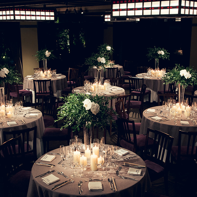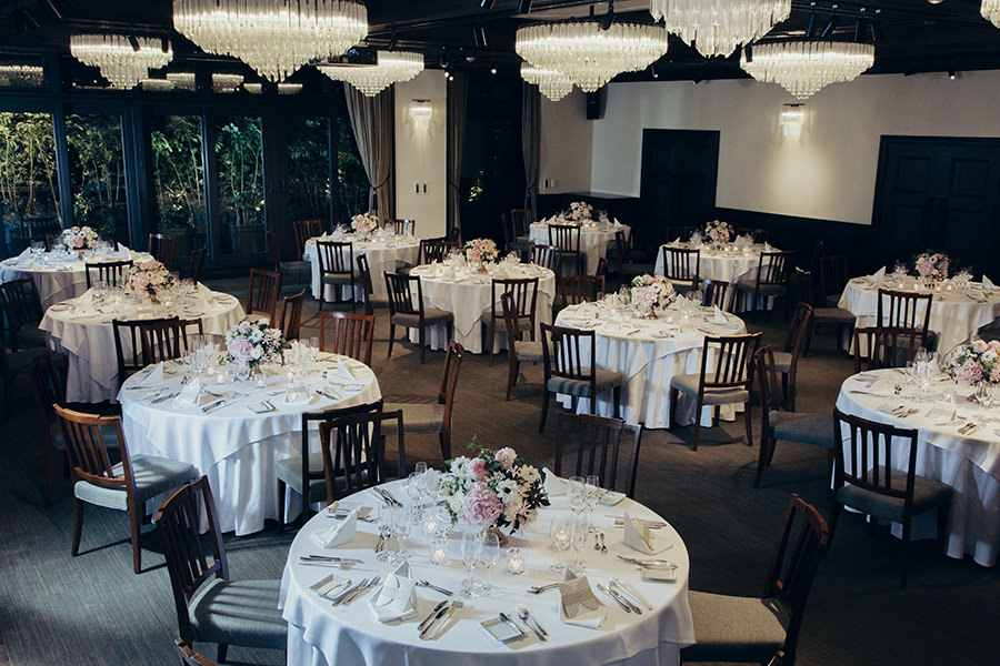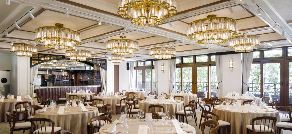 開放的な2面窓とモダンな照明が印象的な3階の「ザ オリエンタル ルーム」。多目的にご活用いただけるプライベートテラスのある会場です。最新のトレンドを取り入れつつ 長く愛していただけるデザインに一新いたしました。併設するキッチンから温かいお料理をお届けします。