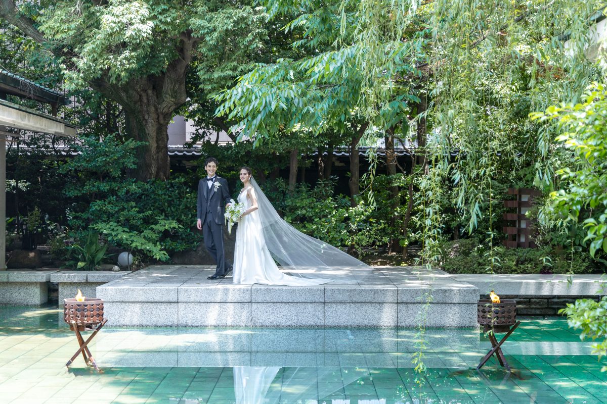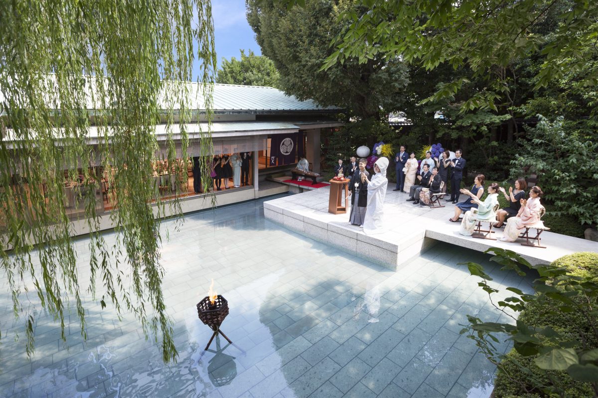「流れ床」の日本庭園の中央に佇む石舞台「水鏡」での和婚式。水面にはおふたりの美しい晴れ姿を映し、それを取り囲む木々はおふたりを盛大に祝ってくれているかのような晴れやかな舞台です。